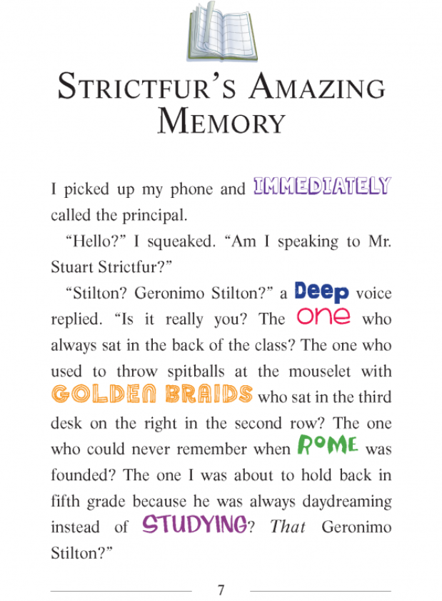The Geronimo Stilton book series encouraged young readers to feel excitement with each word on the page. The constantly changing weights, typefaces, colors, and forms the writing takes shows readers that words can be playful and fun.